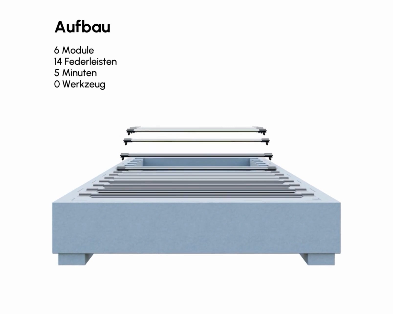 Damit jede:r in eurer Familie bequem liegt, liefern wir euch anstelle eines sperrigen Holzlattenrosts einzelne Federleisten, die in drei verschiedene Härtegrade unterteilt sind. Durch unterschiedliche Anordnungsmöglichkeiten der Federleisten können unterschiedliche Liegehärten erreicht werden. Dies wird in der Aufbauanleitung detailliert erklärt.