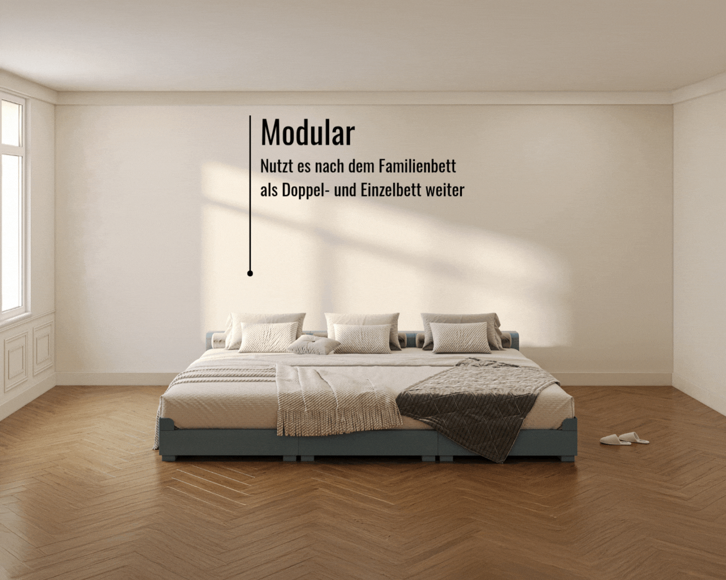 Dank seiner robusten und langlebigen Beschaffenheit begleitet dich das PALU Familienbett viele Jahre. Wenn das gemeinsame Schlafen endet, kannst du die modularen Rahmen einfach trennen und als Doppelbett, Kinderbett oder Einzelbett weiterverwenden. So entscheidest du dich mit PALU bewusst gegen den Fast-Furniture-Trend – und vielleicht für das letzte Bett, das du jemals brauchst.