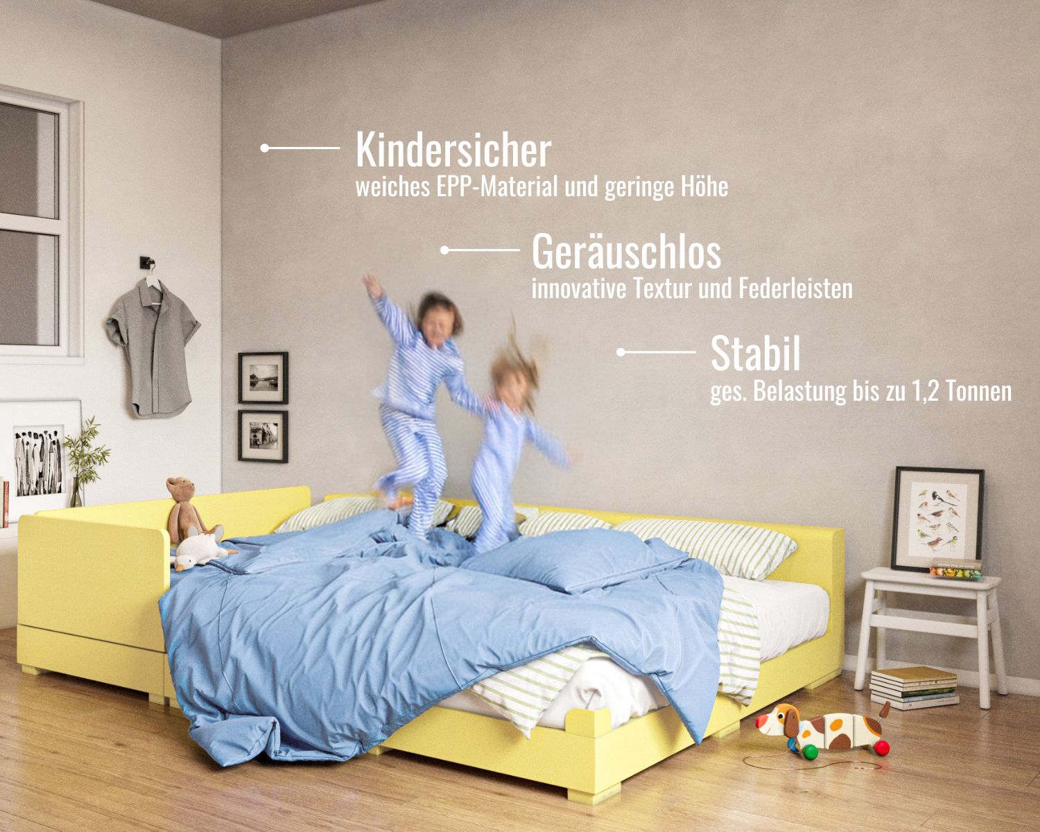 Wir setzen auf Monomaterialien, Produktion in Deutschland und ein durchdachtes Design, das echte Kreislauffähigkeit ermöglicht. Der Rahmen, das Kopfteil und der Rausfallschutz bestehen aus innovativem EPP, das zu 95 % aus Luft und zu 100 % recycelbar ist – extrem leicht, kompakt verpackt und damit nicht nur CO₂-sparend im Transport, sondern auch besonders kraftschonend im Aufbau - komplett ohne Werkzeug.