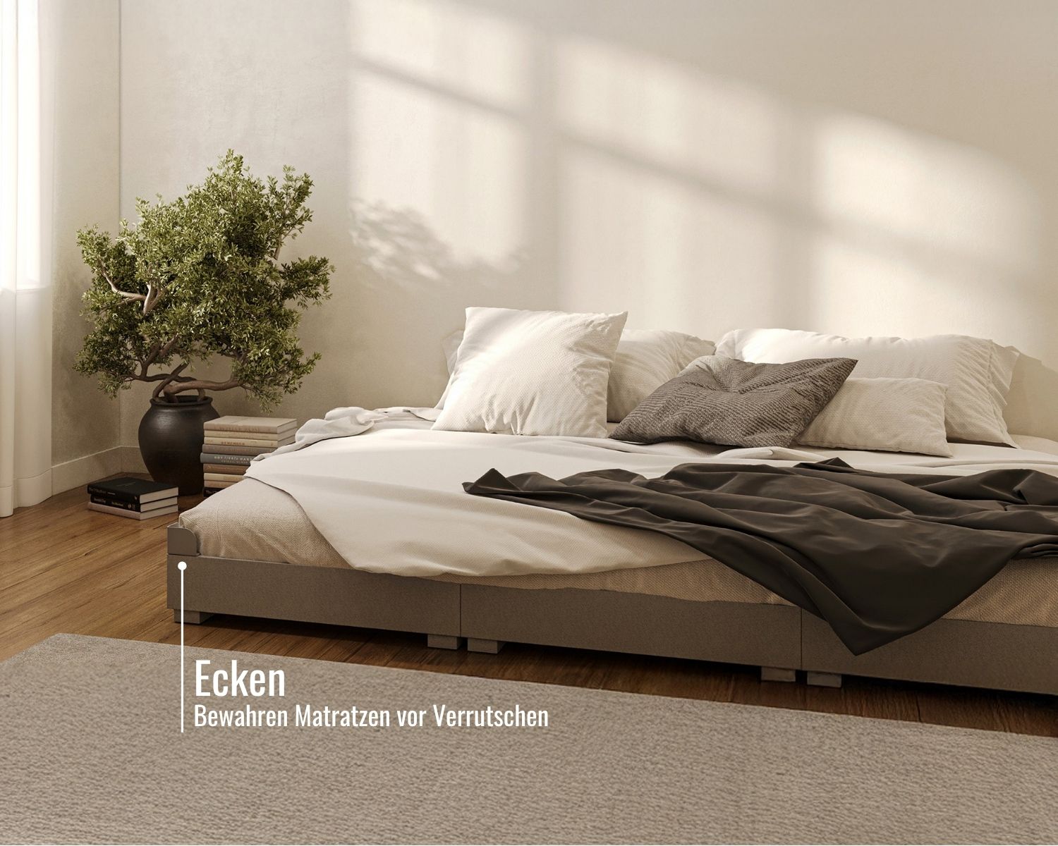 Ihr bestellt ohne Kopfteile und ohne Rausfallschutz: 3x Bettrahmen, 4x Eckmodule