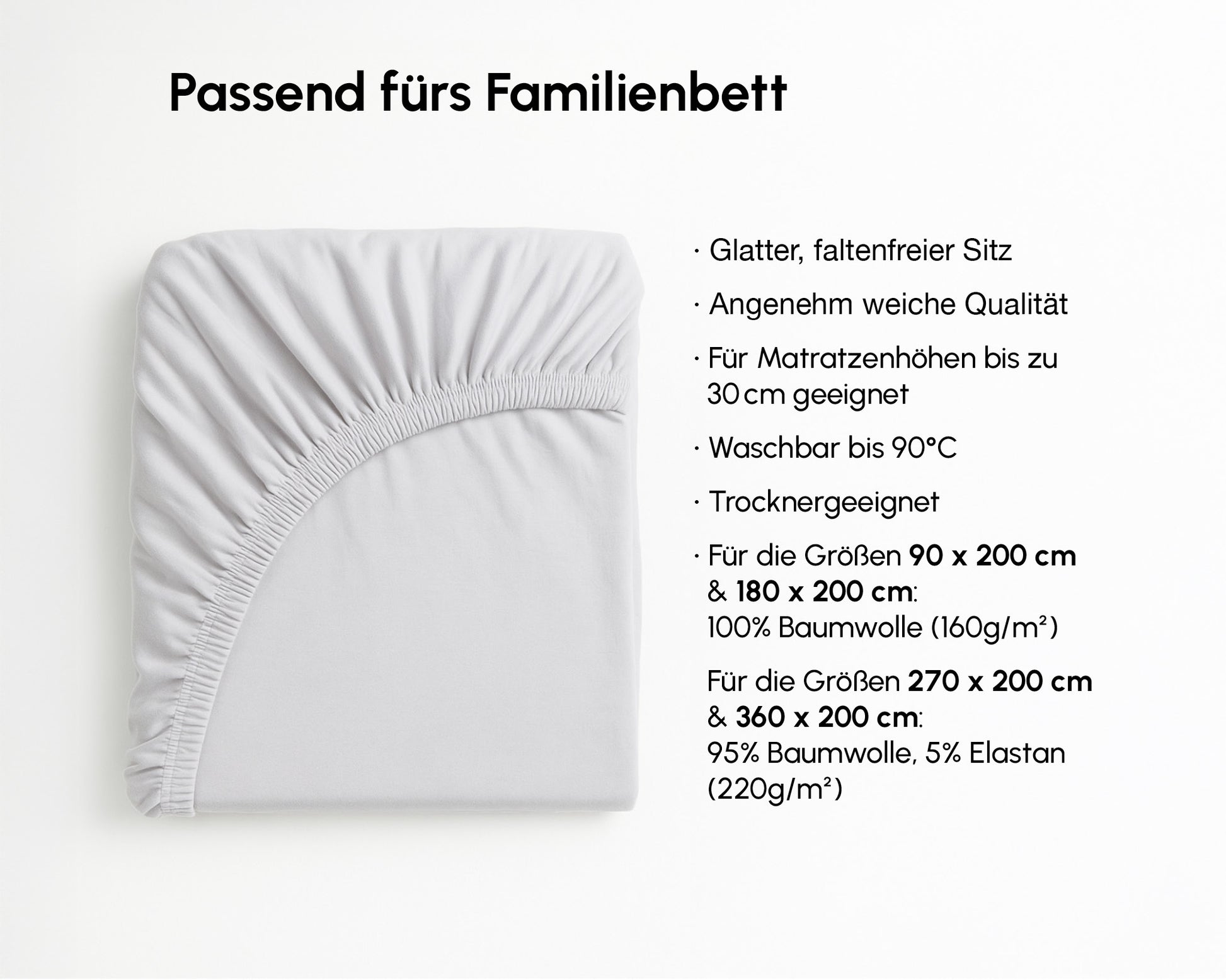 für die Größen 270 x 200 cm & 360 x 200 cm: 95% Baumwolle 5% Elastan 220g/m²